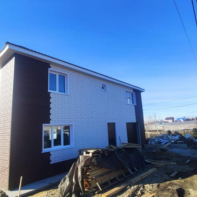 Продается 2-х этажный жилой дом из газобетона +утеплитель, внешне обшит сайдингом под кирпич, фундамент монолитная плита. Первый этаж - кухня+гостинная , жилая комната, санузел, гараж. Второй этаж – две детских комнаты, спальня, санузел. Ремонт будет полностью сделан под «ключ» - коридор теплый пол/керамогранит, комнаты линолеум, стены обои, натяжные потолки, межкомнатные двери, отопление –эл.котел, хол.вода –центральная, септик. Участок будет огорожен металопрофилем, ворота откатные.